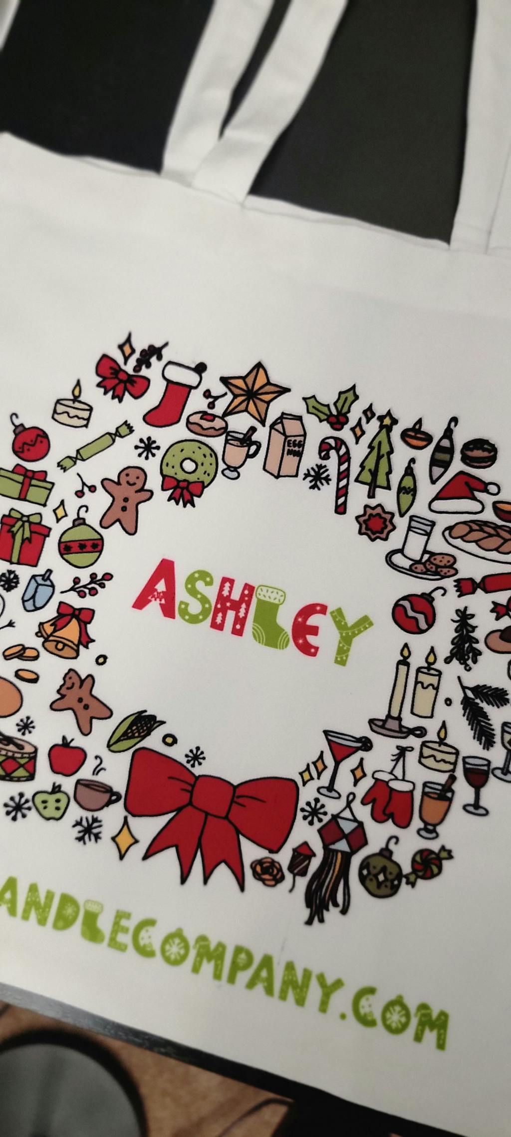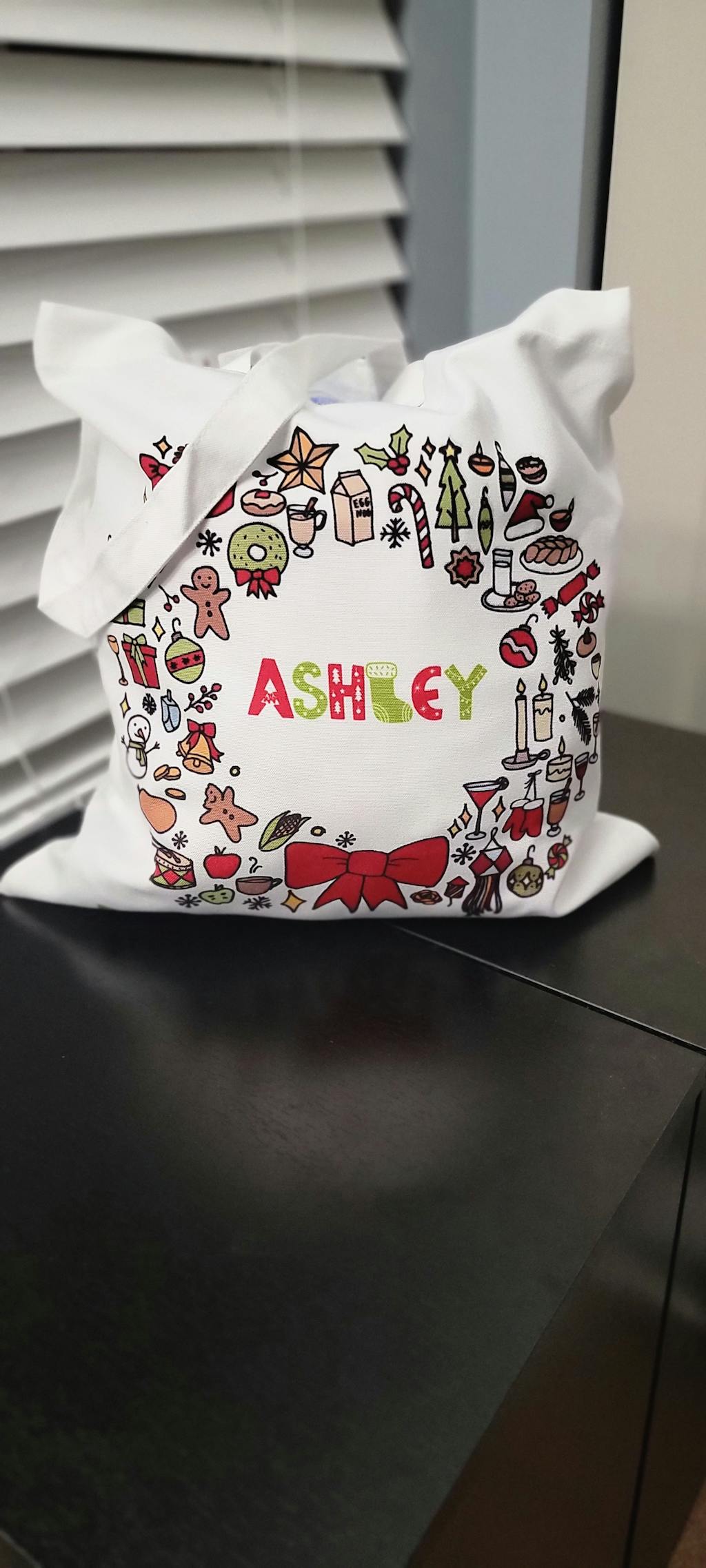 Personalize this tote bag for the perfect holiday gift. Show someone you care with a name written in a festive font, alternating between red and green. Give the gift of style and thoughtfulness this Christmas.