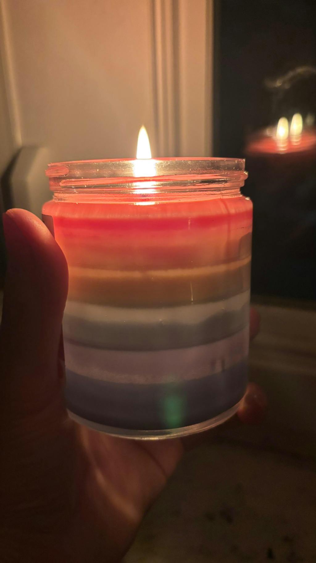 I received this candle as a gift and it is beautiful! Layers of all colors, meticulously arranged into a perfect rainbow. The scent-amazing. It reminds me of a sophisticated flowery perfume. I then purchased one to give as a gift and...don't tell anyone, but I just could not part with it. I am