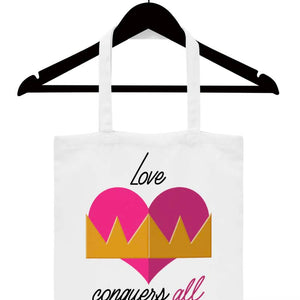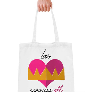 Be the envy of all your friends with this Love Conquers All Valentine's Day Tote Bag. Showcase your love for the holiday with this beautiful and bold design, featuring a heart and crown with the words "Love Conquers All". Perfect for shopping, dates, and more!