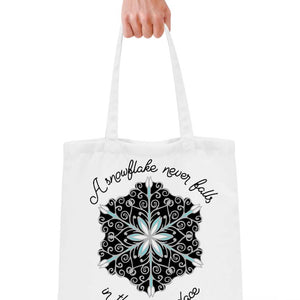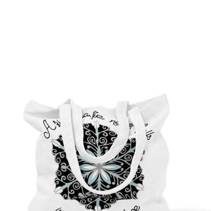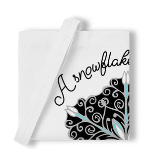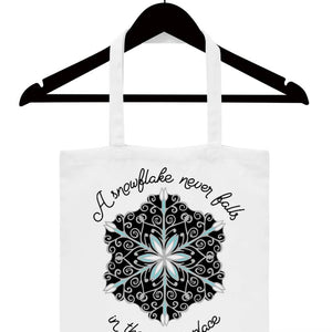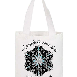 This Snowflake Tote Bag is the perfect stylish and meaningful accent for your everyday look. Its dark and geometric snowflake design is complemented by a zen proverb inscribed around the outside, providing a tranquil reminder to appreciate the present.